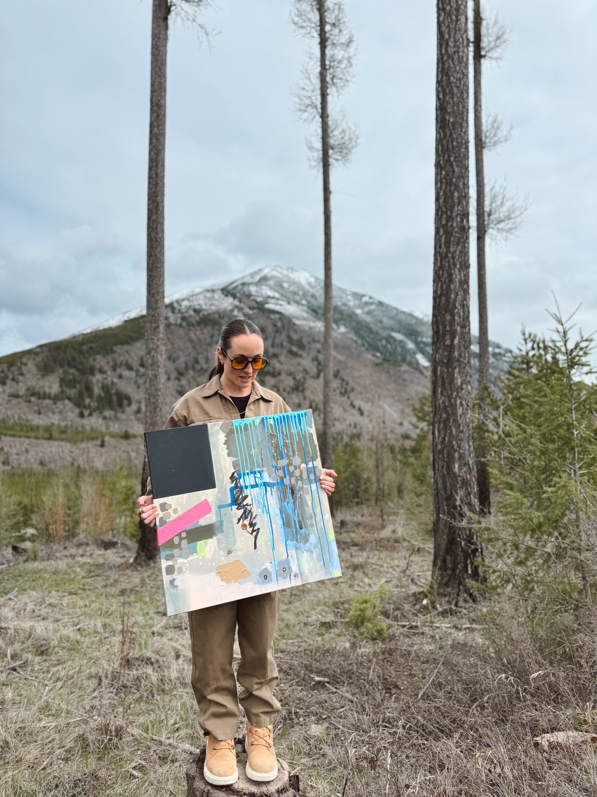 Layered acrylic and mixed media on canvas, this piece carries the cool, silver-grey palette of a Flathead Valley winter softened by unexpected warmth a slash of pink, a whisper of green, two small flowers with bright eyes. For anyone who has ever loved someone across miles, seasons, or simply the busyness of a life well-lived.